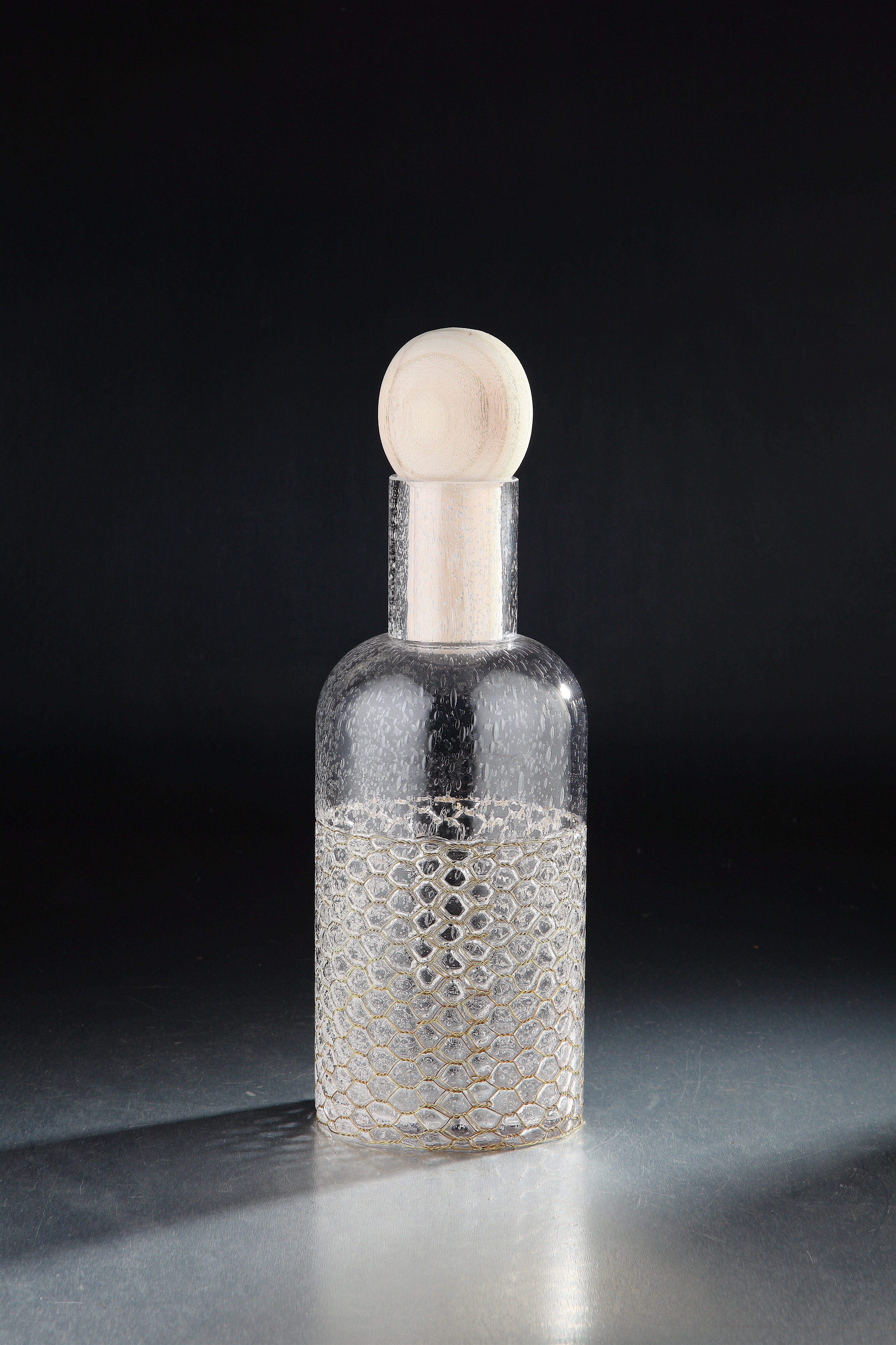 64727 D5.5"H16" - GLASS BOTTLE WITH WIRE MESH AND WOOD TOP