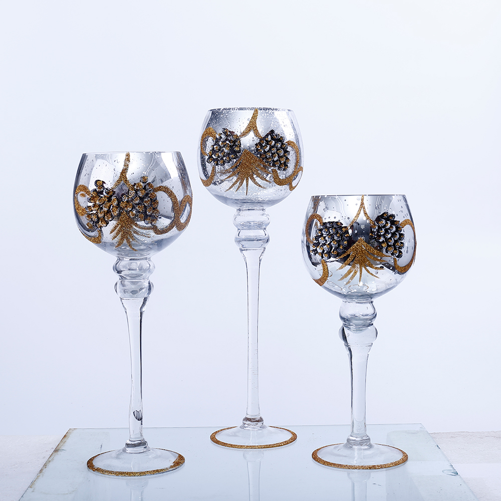 54039 D4.9"H11.8/13.8/15.7" - GLASS CANDLEHOLDER SET WITH PINECONE