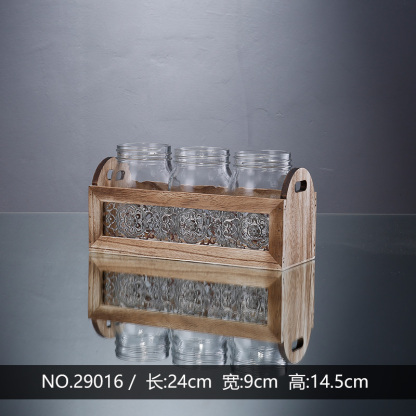 29016 L9.4W3.5"H5.7" - TRIO OF GLASS JARS WITH WOODEN HOLDER